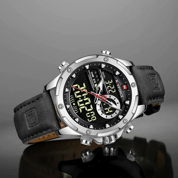 نمایش 24 ساعته , نمایش ساعت دوم , تاریخ شمار , صفحه طرحدار , نور پس زمینه , تایمر , عقربههای شبتاب , آلارم