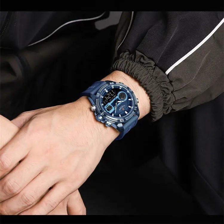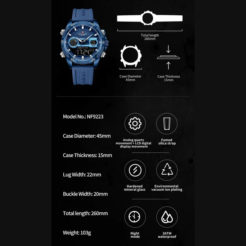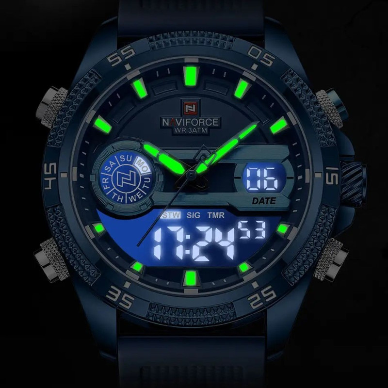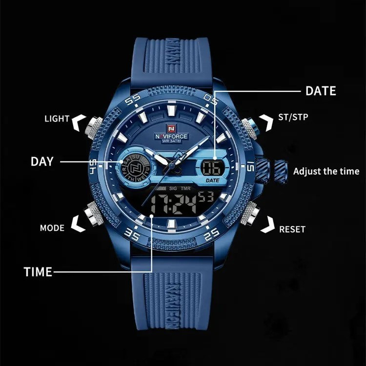 نمایش 24 ساعته , نمایش ساعت دوم , تاریخ شمار , صفحه طرحدار , نور پس زمینه , تایمر , عقربههای شبتاب , آلارم