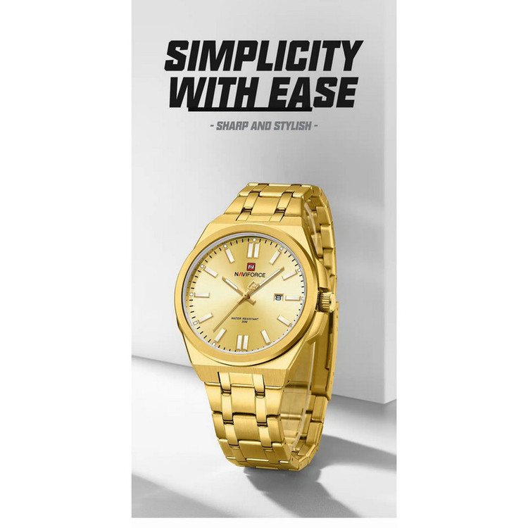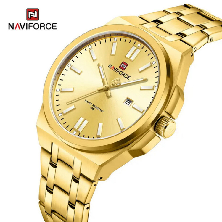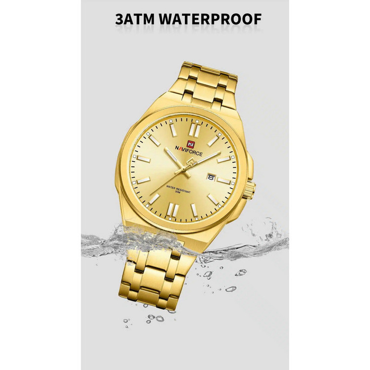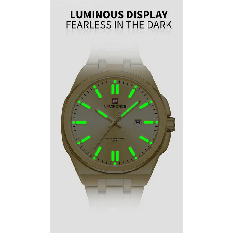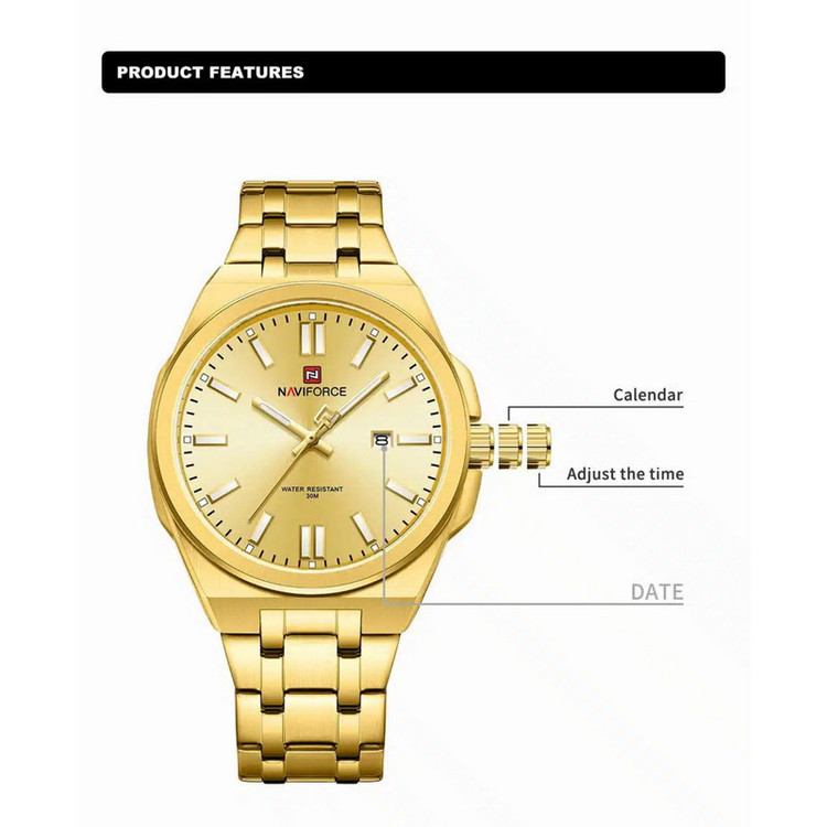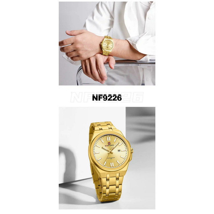 ساعت مچی مردانه NAVIFORCE NF9226 دارای موتور قدرتمند کوارتز ژاپنی با تقویم روزشمار است. این نوع محصول نیروی مورد نیاز خود را از طریق یک باتری تامین میکند. بدنه و بند ساعت با طراحی ارگونومیک از جنس استیل توپر و رنگ ثابت برای راحتی ساخته شده است و به خوبی روی مچ دست قرار می گیرد.عقربه ها و اعداد شب تاب، دید واضح را در شرایط کم نور تضمین می کنند. تعهد Naviforce به کیفیت در انتخاب مواد درجه یک در این ساعت می درخشد و دوام و تجربه پوشیدن برتر را تضمین می کند. این ساعت با درجه مقاومت 3ATM در برابر آب،مقاوم در برابر پاشش آب و استفاده های روزمره در شرایط شرجی و بارانی است.برند و لوگوی نیوی فورس بر روی صفحه،قفل،سرکوک و روی درب ساعت به زیبایی حک شده است. این ساعت بدون دردسر مناسب استایلهای مختلف شخصی است.