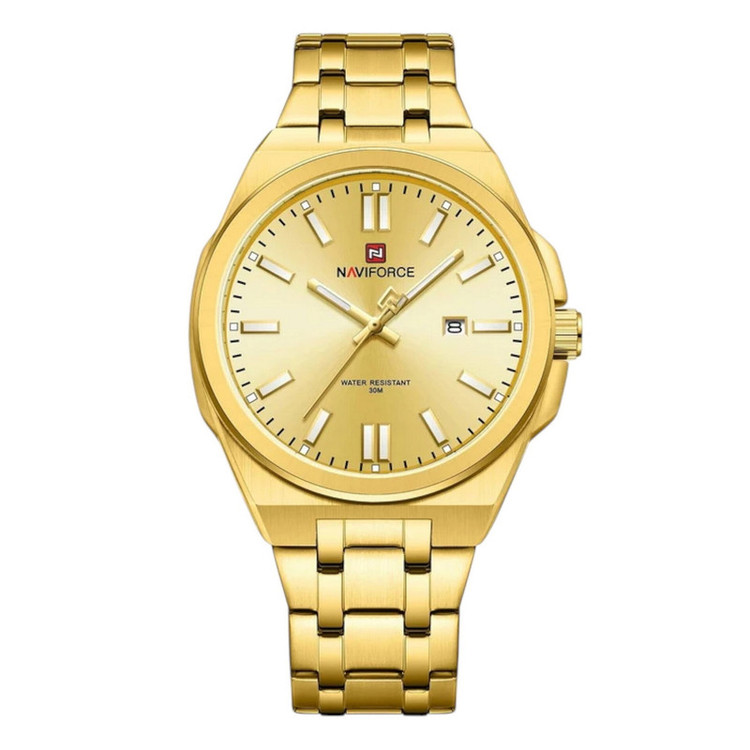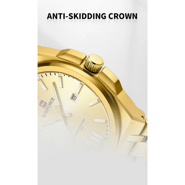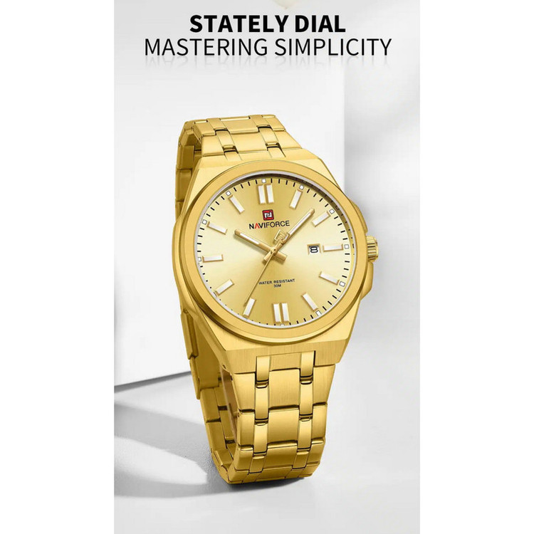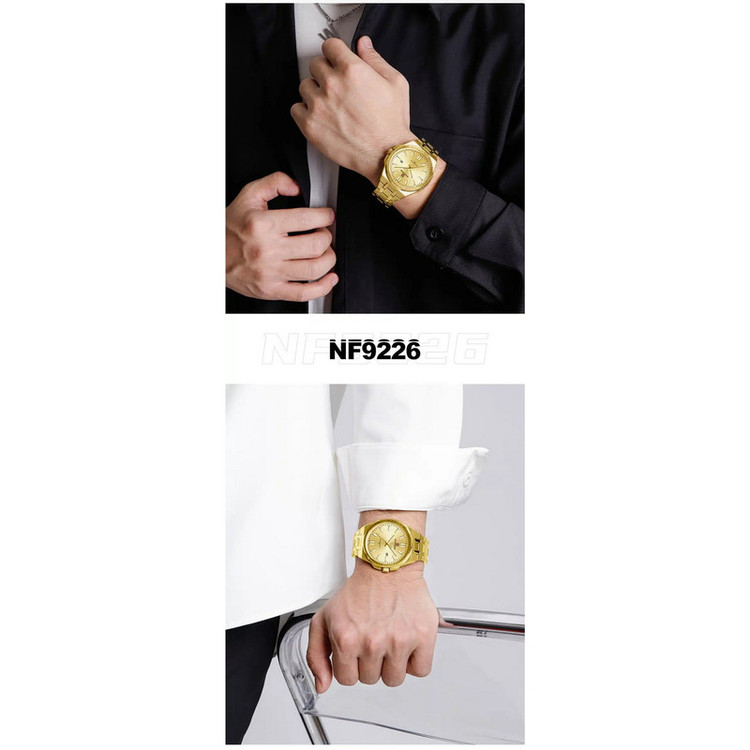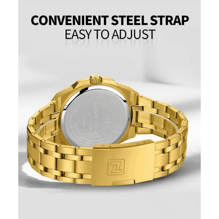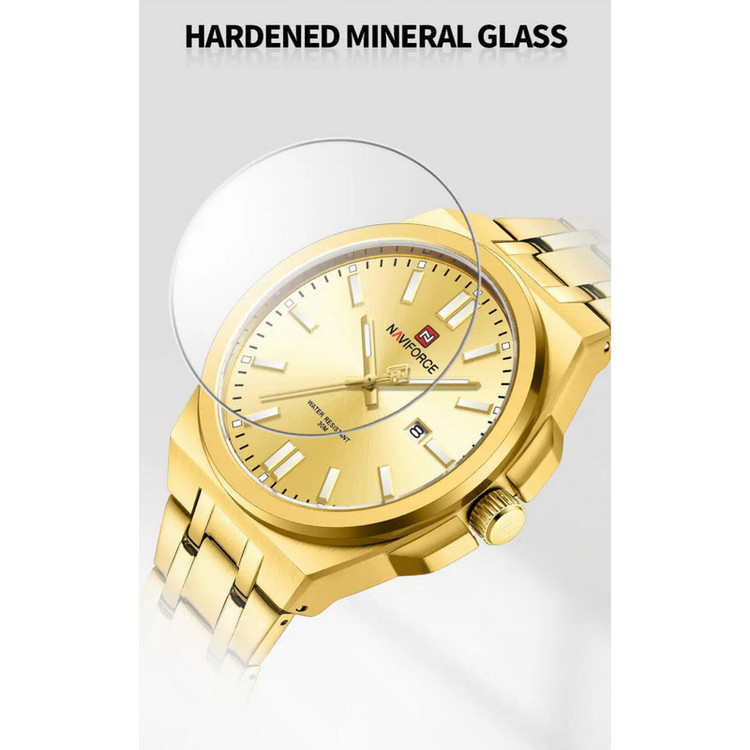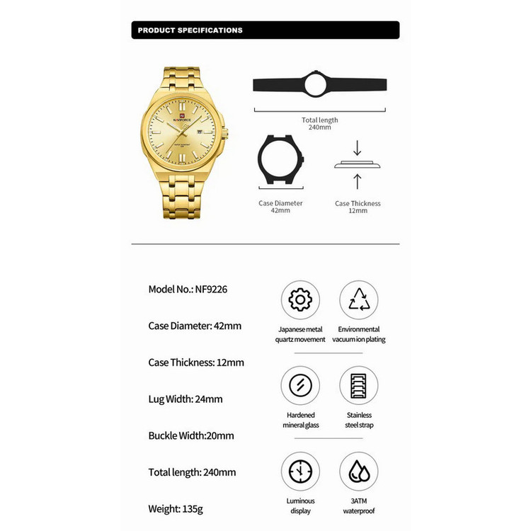 ساعت مچی مردانه NAVIFORCE NF9226 دارای موتور قدرتمند کوارتز ژاپنی با تقویم روزشمار است. این نوع محصول نیروی مورد نیاز خود را از طریق یک باتری تامین میکند. بدنه و بند ساعت با طراحی ارگونومیک از جنس استیل توپر و رنگ ثابت برای راحتی ساخته شده است و به خوبی روی مچ دست قرار می گیرد.عقربه ها و اعداد شب تاب، دید واضح را در شرایط کم نور تضمین می کنند. تعهد Naviforce به کیفیت در انتخاب مواد درجه یک در این ساعت می درخشد و دوام و تجربه پوشیدن برتر را تضمین می کند. این ساعت با درجه مقاومت 3ATM در برابر آب،مقاوم در برابر پاشش آب و استفاده های روزمره در شرایط شرجی و بارانی است.برند و لوگوی نیوی فورس بر روی صفحه،قفل،سرکوک و روی درب ساعت به زیبایی حک شده است. این ساعت بدون دردسر مناسب استایلهای مختلف شخصی است.