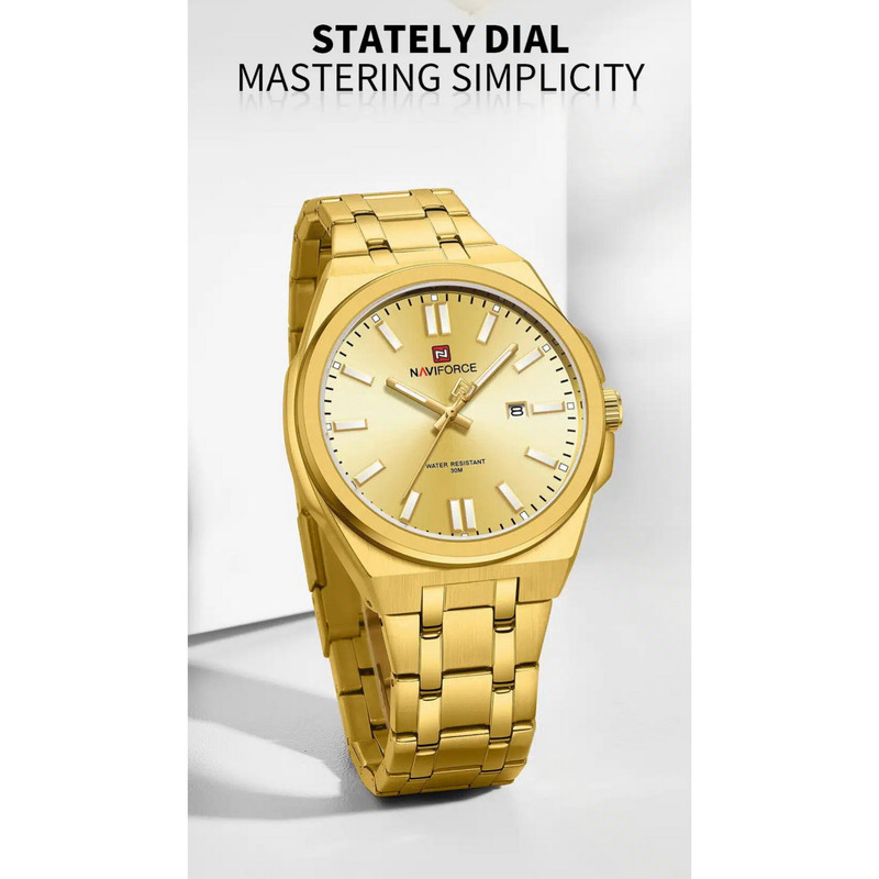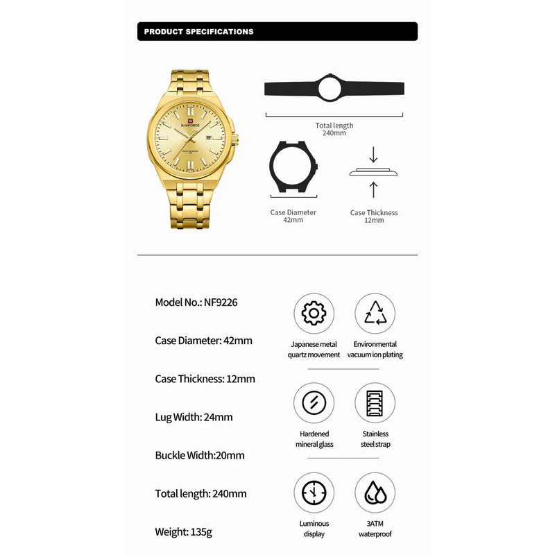 ساعت مچی مردانه NAVIFORCE NF9226 دارای موتور قدرتمند کوارتز ژاپنی با تقویم روزشمار است. این نوع محصول نیروی مورد نیاز خود را از طریق یک باتری تامین میکند. بدنه و بند ساعت با طراحی ارگونومیک از جنس استیل توپر و رنگ ثابت برای راحتی ساخته شده است و به خوبی روی مچ دست قرار می گیرد.عقربه ها و اعداد شب تاب، دید واضح را در شرایط کم نور تضمین می کنند. تعهد Naviforce به کیفیت در انتخاب مواد درجه یک در این ساعت می درخشد و دوام و تجربه پوشیدن برتر را تضمین می کند. این ساعت با درجه مقاومت 3ATM در برابر آب،مقاوم در برابر پاشش آب و استفاده های روزمره در شرایط شرجی و بارانی است.برند و لوگوی نیوی فورس بر روی صفحه،قفل،سرکوک و روی درب ساعت به زیبایی حک شده است. این ساعت بدون دردسر مناسب استایلهای مختلف شخصی است.